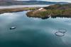 An overhead shot of salmon farming operation