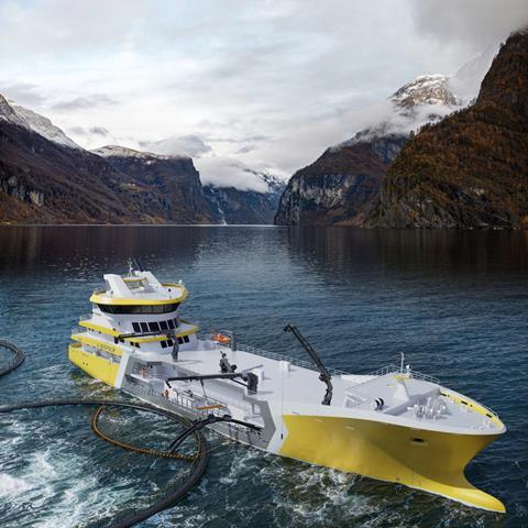 New harvest vessel Tauriko is designed to significantly bring down the cost per kilo of delivering slaughtered salmon on a large scale. It will have capacity to load and bleed 200 tonnes of salmon per hour and to hold up to 750 tonnes in its RSW tanks. Achieving a top service speed of 18 knots is also part of the design brief, enabling cargos to be delivered fast. It will be outfitted with a new unloading system, expected to substantially reduce unloading and cleaning time.