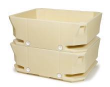 When the new generation of tubs is compared with the traditional design it is notable that the slots for forklift forks have been moved to the side of the tub, instead of the conventional place. This has changed the appearance of the tub considerably and has made it possible to design it in such way that when stacked the upper tub seals the tub below, thereby preventing dirt and other impurities from dropping into the tubs. In addition, the insulating factor of the tub has increased tremendously and less oxygen surrounds the ingredients. The design also lowers the centre of gravity, which has improved stacking.