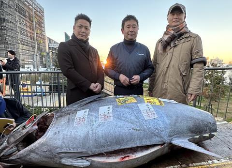 The first fish auction of 2023 at the Toyosu Fish Market, at the Kaiten Sushi Ginza Onodera in Tokyo, saw Japanese wholesaler Yamayuki and sushi chain operator Onodera Group pay ¥36,040,000 (about US$ 275,000) for a 212kg bluefin tuna.
