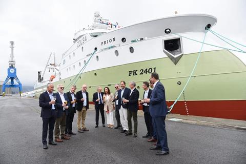 Eighty-five-metre Prion has a 14-metre beam and is the yard’s own design. The handover of the new vessel took place in the Port of Marín, chaired by the President of the Xunta Alfonso Rueda, and attended by Pescapuerte Group president Jose Puerta Prado, Stuart Wallace representing the Fortuna Group, and José Ramón Regueira on behalf of Nodosa, along with around 400 guests who included staff of the yard, the two companies, suppliers and various authorities.