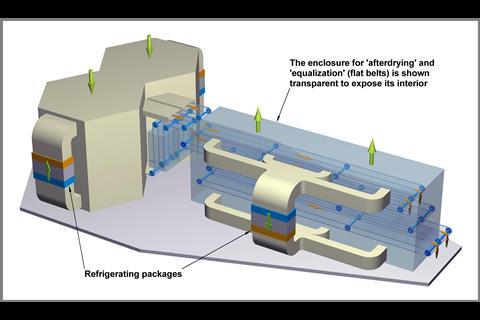 Ambient temperatures above 20°C are usually associated with high relative humidities. Air for curing must then be recirculated and dehumidified through refrigeration. Air returning from the goods enters the package through the cooler; there it is dehumidified, cooled and finally reheated in the heater. Excess heat from electric motors driving the compressor and fans is rejected through an external air cooled condenser. Non-condensable odour contaminated gases are purged, thus rendering the plant odour free.