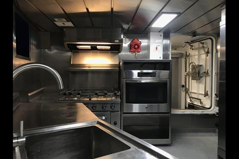 The crew accommodation comprises 3 x 4 berth cabins and 2 single berth cabins as well as WC facilities, all positioned on the shelter deck below the wheelhouse. On main deck level forward there is a large mess and lounge area which allows for comfortable seating and an area where the crew can relax and watch tv. The comprehensive galley is accessed from the mess with separate provisions store and is fitted out to a modern and high standard with commercial quality equipment.