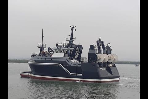 The vessel combines some traditional features with a distinctive modern design and layout and the latest in fishing technology. The vessel works the traditional local style of pot for crab fishing using a hydraulically operated main deck side hatch and hauler to starboard. This is combined with the ability to completely close this main deck area mid-ships, allowing it to convert to a full factory processing deck for modern fish processing and on-board freezing.